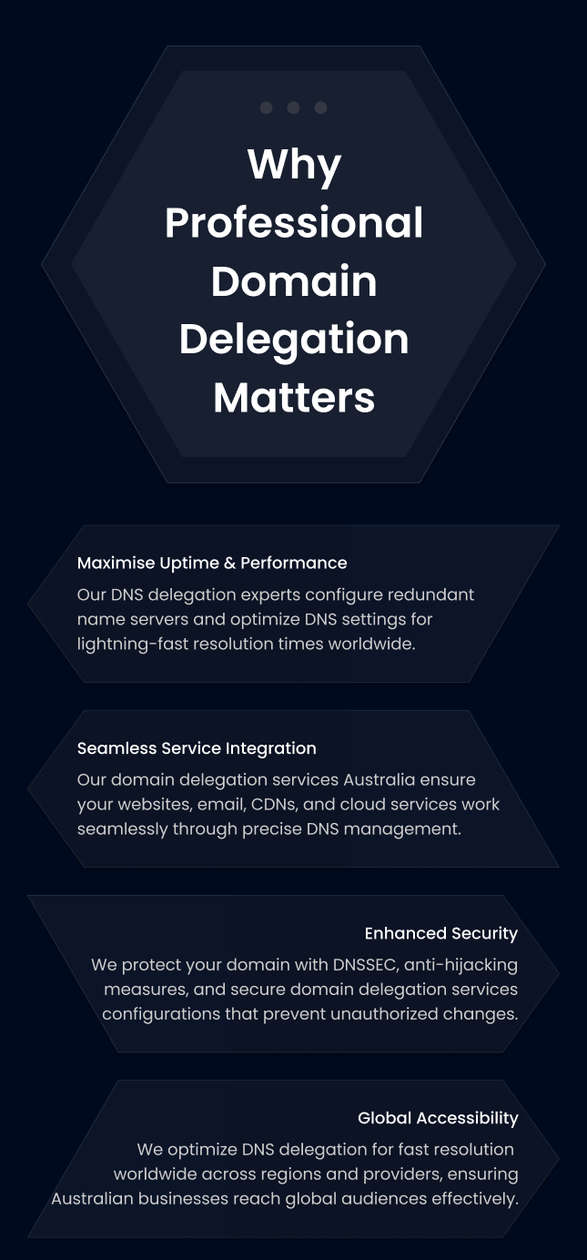 Domain delegation is the process of assigning responsibility for a domain’s DNS records to specific name servers. This critical setup determines where your website traffic goes, how your email is routed, and how all your domain-related services function across the internet. Our domain delegation services Australia ensure this vital infrastructure is configured perfectly for your business needs.